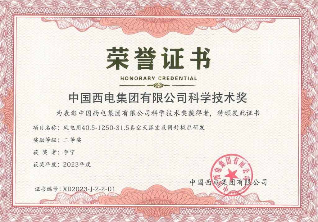 近日,寶光股份《換流變壓器有載分接開關用真空滅弧室研發》與《風電用40.5 kV/1250 A-31.5 kA真空滅弧室及固封極柱研發》兩個技術創新項目,分別榮獲2023年度中國西電集團科學技術獎“一等獎”與“二等獎”!